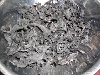 | B砂が容器の下にたまる事もあります。アラメを上方よりつまみ上げてザルなどに移して下さい。 アラメの色素がとけて黒い水になります。この黒い水を炊込みご飯に使います。(底にたまった砂などは捨ててください) |