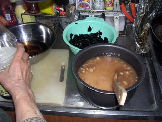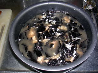 ![]() B鶏肉と水でもどしたアラメも入れ混ぜます |