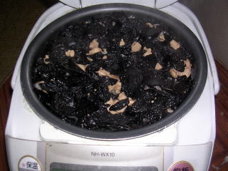 ![]() Aといでいた米にアラメの黒汁を入れます |