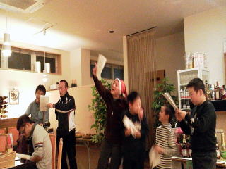 頑張っています〜ビンゴゲームも盛り上がりました!!周平部長からあがった人から、皆さんの今年の一文字を書いてと〜楽しかったです!!