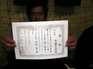 ![]() 昨年杉山賞受賞・奈緒ちゃんへの賞状授与。 代理で、月坂さんが受け取る。 |