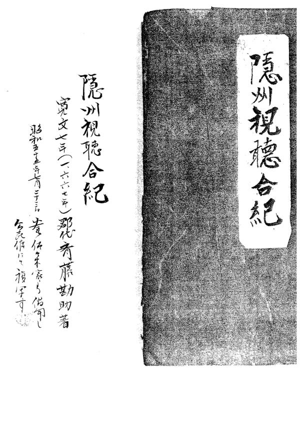 隠州視聴合記・隠岐の書かれている事で、最も古く信憑性のあると言われている文献です。 1667年、出雲の役人で隠岐の郡代であった斉藤勘助によって書かれたものです。 勘助は自分の足で歩き、その土地、土地で話を聞き書きまとめました。(隠岐の島町図書館より複写)