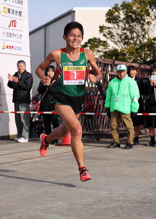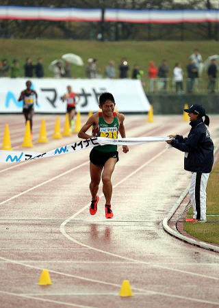 おそらく集団に追いつかれずに最後まで走り続けも、常に先頭を走り続けてハーフからは独走で出した