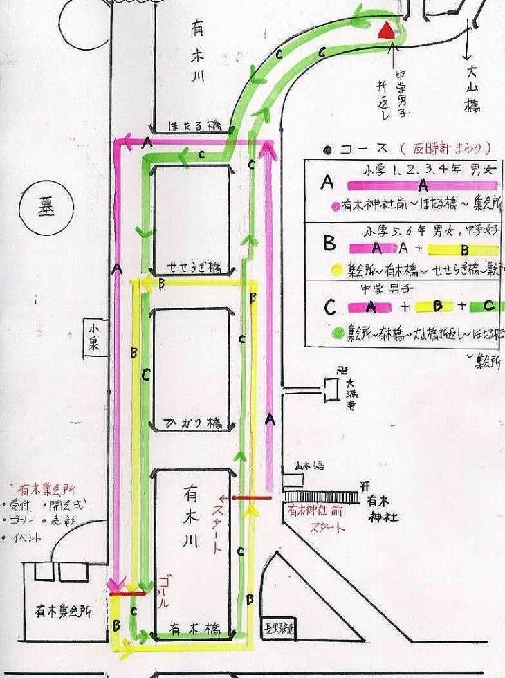 ・小学5.6年と中学女子2109.75mは、小学1.2.3.4年の1000mまでは同じで、集会所から、1番目の有木橋を渡り、