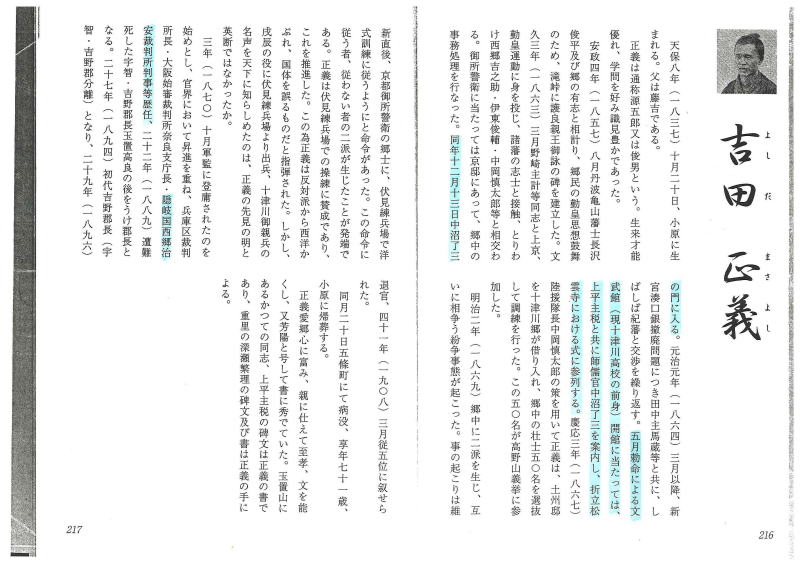 吉田正義(1837年-1908年)奈良県十津川村生まれ・ 1863年隠岐の島中村出身の中沼了三先生を京都から上平主税とともに 案内した。その時歩いた道が熊野みちである。 その後1887年(明治20年)頃隠岐の島、港町の裁判所に赴任した。