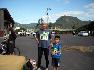 ![]() スタート会場・アイランドパーク魚体育館で長男とペアに出るぞ 高田山をバックに |