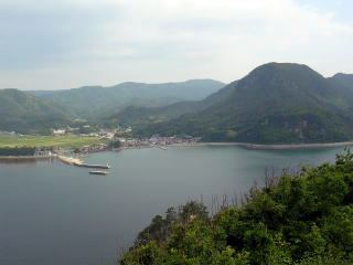 ![]() 都万を一望・右上の山が都万のシンボルの高田山 |