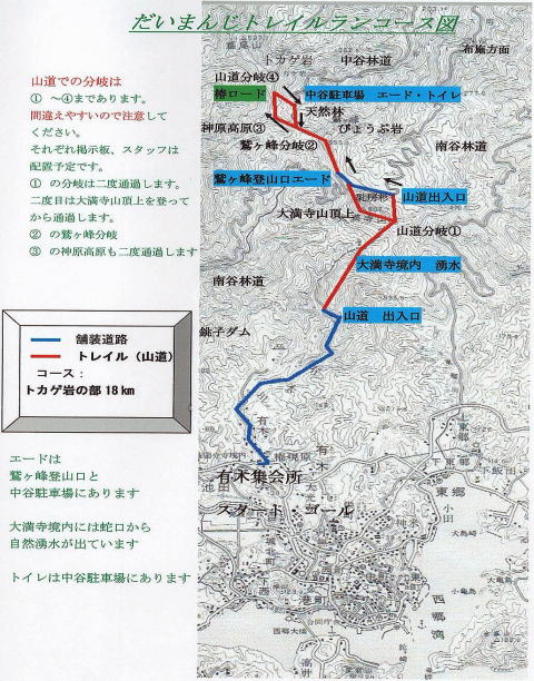 コース 有木集会所〜 大山神社〜 坂上の50mの橋 を過ぎて右手から小さな階段を上り山道に入る 大満寺を過ぎて@ 最初の分岐点を 真っすぐ下る〜 アスファルトの林道に出る・左折 すぐに乳房杉〜 500mほどで 鷲ヶ峰登山口に ここから再び山道 A鷲ヶ峰分岐〜 B神原高原に〜 椿ロードを駆け Cの分岐を右に 下る 中谷駐車場に ここから天然林を過ぎ再びBの 神原高原に Aの鷲ヶ峰分岐を過ぎ 鷲ヶ峰登山口に ここから大満寺山頂上〜 @の山道分岐を 右に来た道を下り ゴールの 有木集会所に |