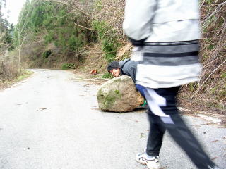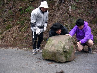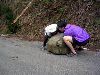 ![]() 帰りに巨石発見。司君がかかえようとするが・・ |
