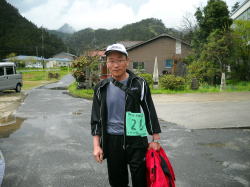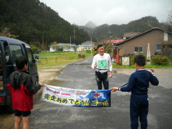 今までにはなかったゴールでの風景です。右の大きな山は、隠岐第2の山・598mの葛尾山(つづらおさか)です。