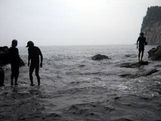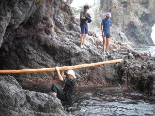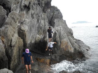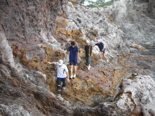 ![]() 日本でも有数のアルカリ岩地帯・岬の脇さんにガイドをしていただきます |