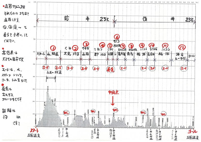 ●コース全体を、@〜Kという感じで、(五箇の久見、福浦などの地区で)区切っています。